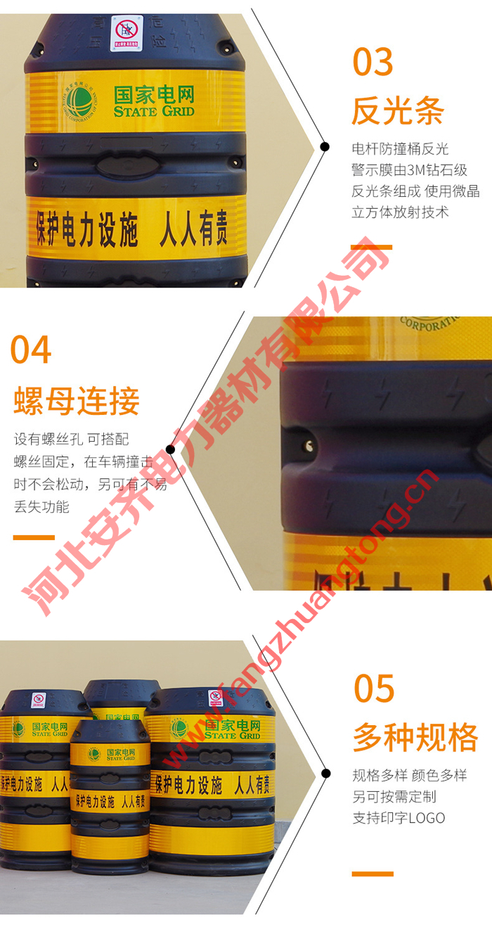 我公司生产的电杆警示防撞桶,克服了以上的种种问题,很好的解决了电线杆在交通安全方面的隐患,受到了用户的一致好评。